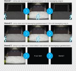 - Het licht gaat automatisch aan als het donker wordt en blijft 4 uur lang aan. Na deze 4 uur schakelt de lamp over naar stand 1 (sterk licht).