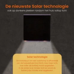 · Volledig waterdicht – De solar wandlamp heeft een volledig IP65 waterdicht ontwerp. Hierdoor hebben regen, sneeuw, vorst en zelfs hitte geen invloed o de lamp.