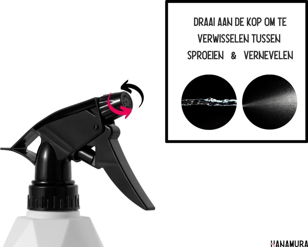 De sprayflacon kan zowel sproeien als vernevelen en is daarmee geschikt voor elke soort bloem en plant. Het waterreservoir heeft een capaciteit van 600ml en wordt gemakkelijk gevuld via de extra brede hals (4cm). De hals is ook lekdicht; geen geknoei meer!