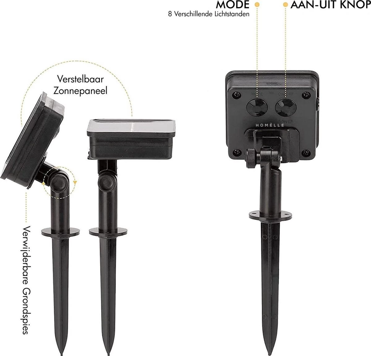 Vanaf het zonnepaneel tot het eerste lichtbolletje zit 2 meter en vanaf dat punt zijn het 30 LED bolletjes op 10 centimeter afstand van elkaar. Door de IP65 beveiliging is het product beschermd tegen hitte, vorst, hagel en regen.