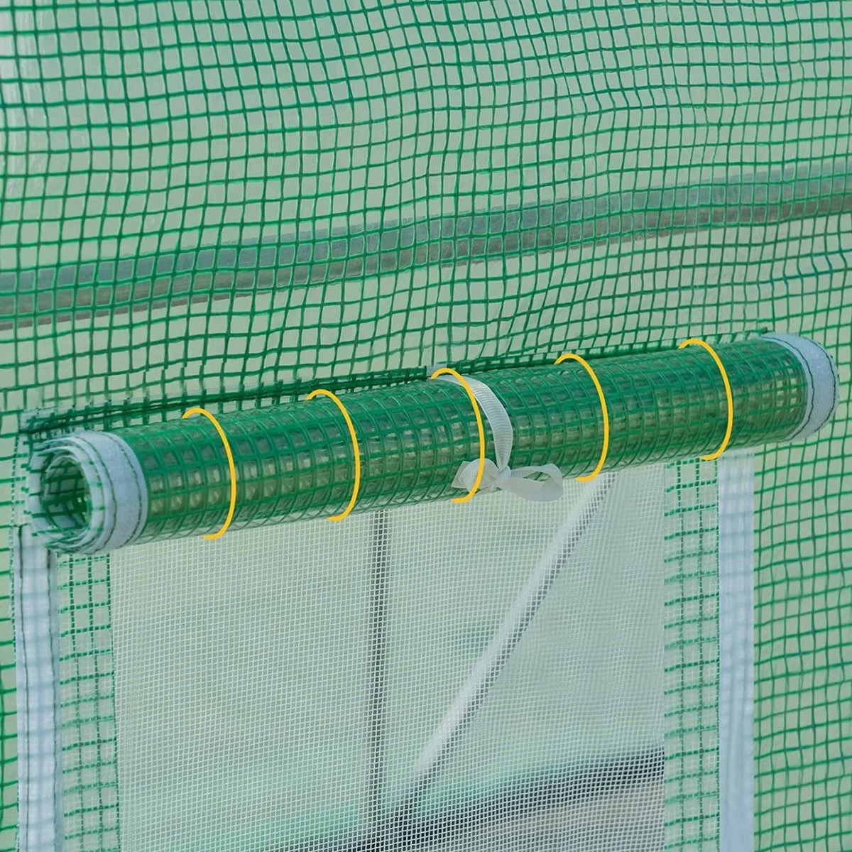 6 zijruiten: De ramen bestaan uit muggengaas aan de binnenkant en uit PE gaas Het buitennet kan op gerold worden v
