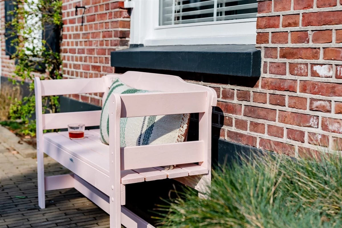 Tuinbankje Amelie wordt geleverd in blank vurenhout. Als je hem permanent buiten gaat gebruiken is het wijs om hem te behandelen met buitenverf of impregneermiddel. Op onze website vind je diverse vrolijk kleuren! Als je hem binnen gaat gebruiken zou je hem kunnen aflakken met een transparante lak. Op deze manier zie je de prachtige houtstructuur nog en is hij eenvoudig schoon te houden