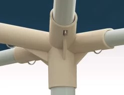 De zijwanden met 12 boogramen zijn oprolbaar indien nodig. Het paviljoen is voorzien van 4 verankerbare poten en een metalen constructie. Het dak – en zijbekleding is van waterafstotend materiaal. Het binnenframe is gemonteerd via beveiligde verbindingen.
